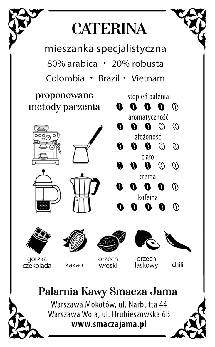 Caterina is a blend for those who associate coffee primarily with "little black". It gives the brew a highly concentrated, and above all intensely caffeine. Ideal for a coffee machine, it can also be brewed in a coffee shop and Turkish, and even some alternative methods - in the siphon and French press (Note: on request, the beans can be ground - please indicate the desired grinding method when choosing the variant for potting, in Turkish; universally - for a coffee shop, espresso machine, aeropress; thick - for French press, chemex, drip).