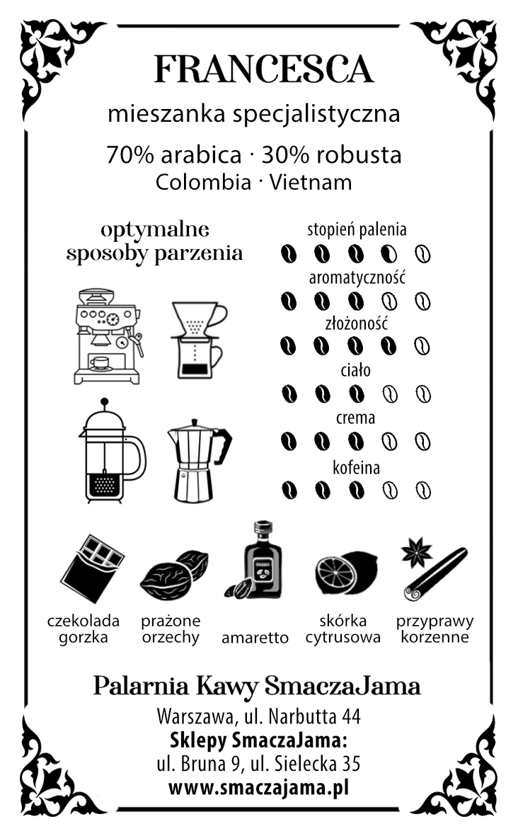 A very classic mix of Colombian Arabica and Vietnamese Robusta. The beans are roasted in a small craft roaster that operates in Warsaw's Old Mokotów. The aromatic bouquet is dominated by notes of dark chocolate, caramel and cocoa, but there are also spiciness of à la cayenne pepper and notes of roasted hazelnuts. The brew's consistency is full, very dark, opaque, velvety and dense. Coffee leaves a harmonious, slightly bitter aftertaste, combining root and chocolate accents.