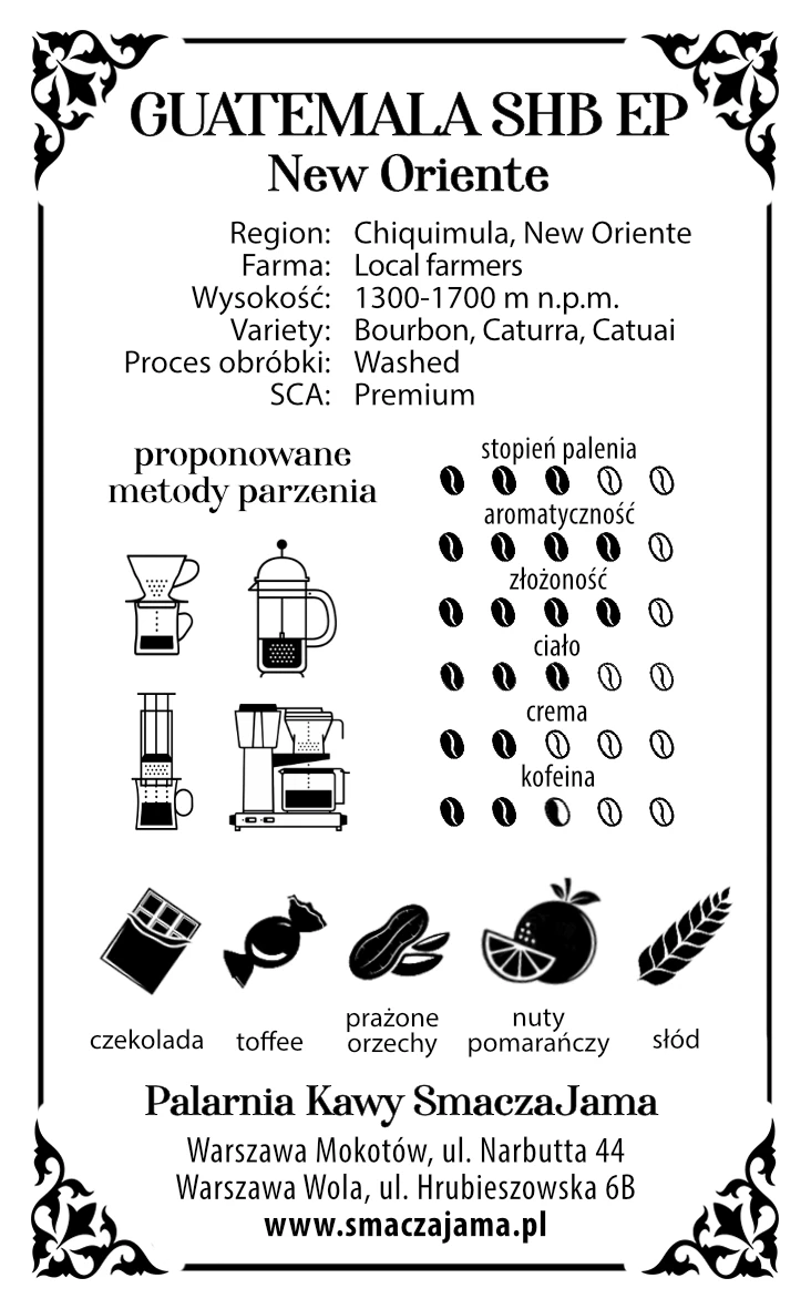 Suggested brewing methods: Guatemala SHB New Oriente is a perfect coffee for a coffee machine and espresso machine, but it is also worth trying it with aeropress and drip.