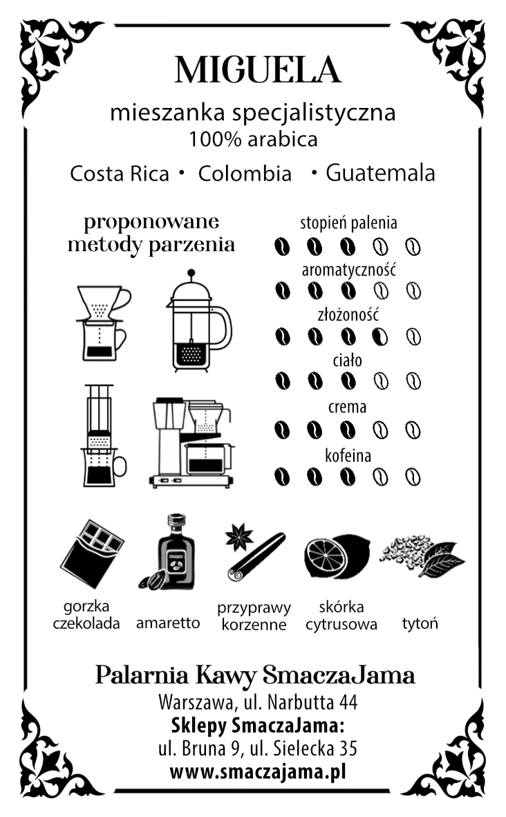 Miguela is a coffee for American and Caribbean coffee lovers who owe their distinctive taste to volcanic soils. It works best in a coffee machine and a coffee machine, but you can also prepare it in Turkish or alternative methods, especially in aeropress. ( Note : on request, the grains can be ground - please indicate the desired grinding method when choosing the variant (fine - for potting, after Turkish; universally - for coffee, espresso, aeropress; thick - for French press, chemex, drip).