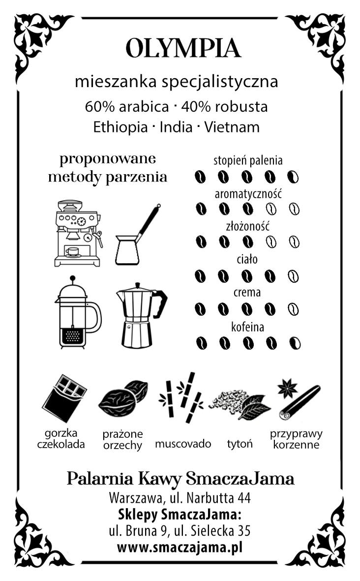 Olympia is a coffee created for those who are looking for a strong, strong taste and need a large dose of caffeine. Ideal for milk coffees, especially brewed in a pressure espresso machine, coffee shop and French press, although it is also worth trying what it tastes like with an aeropress - preferably with a Prismo overlay. (| Turkish; universally - for coffee, espresso, aeropress; thick - for french press, chemex, drip).