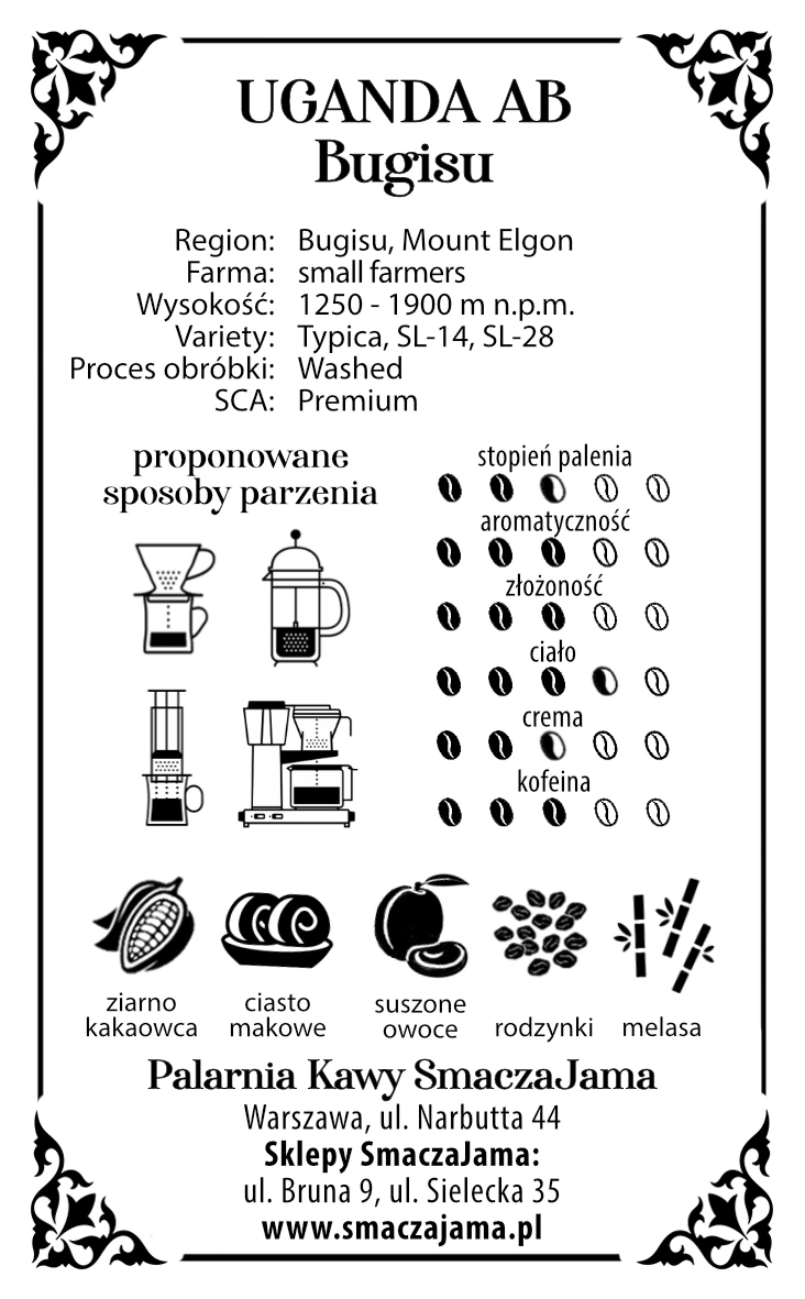 Arabica Uganda Bugishu AA is a coffee that every gourmet of African coffee should try, with a surprising composition of flavor and aroma. The uniqueness of the Arabites from Uganda is first of all its aroma. Sweet raisins and dry chocolate are the dominant notes. Honey and hazelnut are also stuck. The taste is clearly bitter, with low acidity and full body. And this is what is unusual for beans from Uganda. Full body, exceptional body will be appreciated by anyone looking for strong coffee with an unusual combination of taste and aroma.