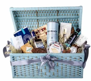 Wiklinowy kufer zawierający luksusowe alkohole, prestiżowe przetwory i wyszukane słodycze. Imponująca kompozycja na wyjątkowe okazje.