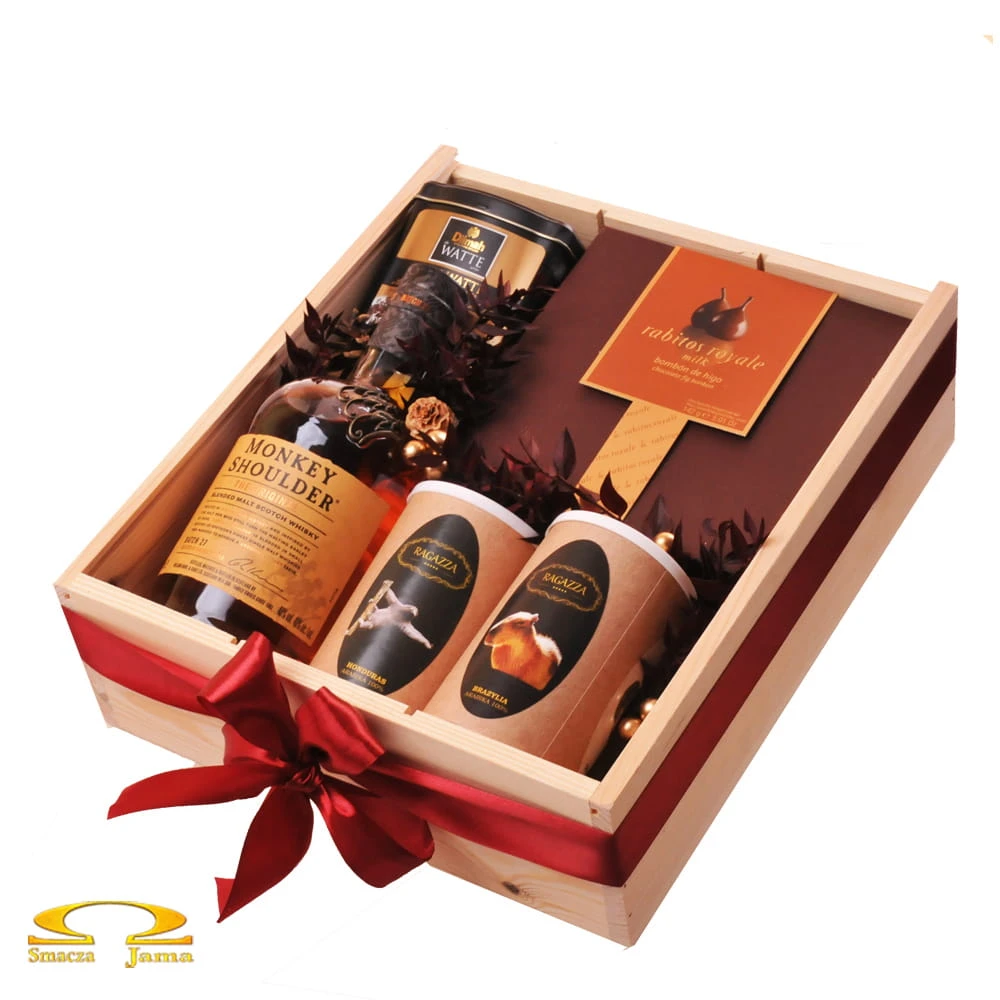 Skrzynka z jasnego drewna, zawierająca znakomitą whisky w niemniej doborowym towarzystwie- rzemieślniczo wypalana kawa, esencjonalna herbata i znakomite hiszpańskie słodycze na bazie owoców figi sprawiają, że upominek staje się wyjątkowym doznaniem. Świąteczne uroczystości bez wątpienia stanowią idealną okazję do jego wręczenia.