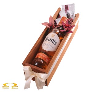 Prawdziwa poezja smaków a zarazem szykowny upominek- drewniana skrzyneczka z zasuwanym wiekiem, której wnętrze zaprasza do zapoznania się z bukietem whisky finiszowanej w beczce po rumie. Dla zaakcentowania szlachetnej obecności tego trunku, w zestawie znalazły się także marcepanowe czekoladki z dodatkiem owocowo- alkoholowego musu.