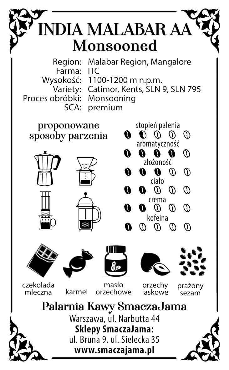 Kawa India Monsooned Malabar jest kawą bardzo charakterystyczną, w której można odnaleźć moc aromatu i smaku. Napar z indyjskich ziaren będzie pozbawiony nut mocno goryczkowych oraz kwaskowatych. Dominujące nuty smakowe to prażony sezam, orzechy laskowe, drewno i miód gryczany.