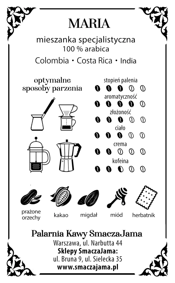 Autorska mieszanka trzech doskonałych arabic z naszej palarni - Kolumbii Medellin Excelso, Indii Monsooned Malabar i Hondurasu Cerro Azul. Mieszanka Maria powstała dla osób ceniących kawy o wyczuwalnych nutach orzechów laskowych, migdałów i kakao. Znajdziemy w niej również delikatną słodką nutę miodu i herbatników. Dzięki odpowiednim proporcjom i doborze arabik, mieszanka dostarczy nam kawę o pełnym smaku, niewielkiej kwasowości i goryczy. Mieszanka dedykowana jest dla osób lubiących kawy aromatyczne, ale łagodne w smaku. Idealnie sprawdzi się jako mieszanka do aromatycznego espresso, a dodanie spienionego mleka da nam słodko-orzechowe cappuccino.