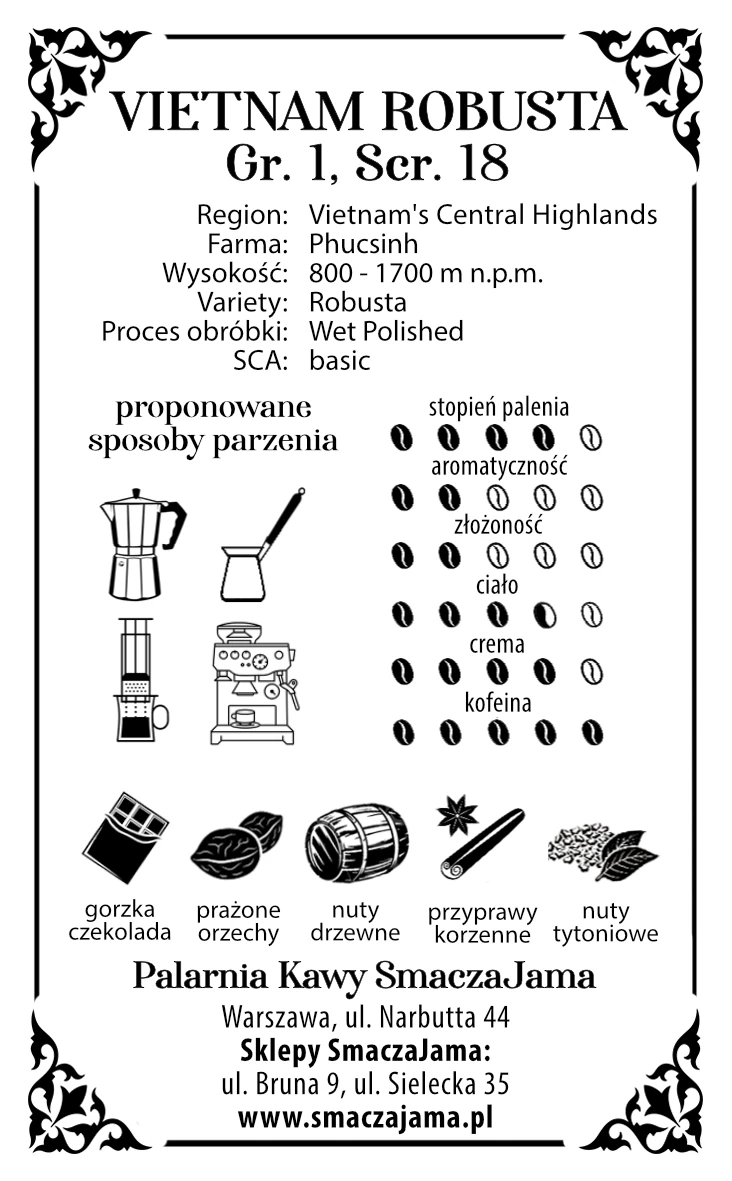 Jeśli potrzebujesz szybkiego pobudzenia, wietnamska robusta na pewno skutecznie rozrusza Twój umysł. Jeśli wolisz dodać lekką pikantność i trochę werwy do swojej ulubionej arabiki, na pewno będziesz zadowolony z takiego połączenia.Ziarno wypalone w małej manufakturze kawowej w Warszawie.